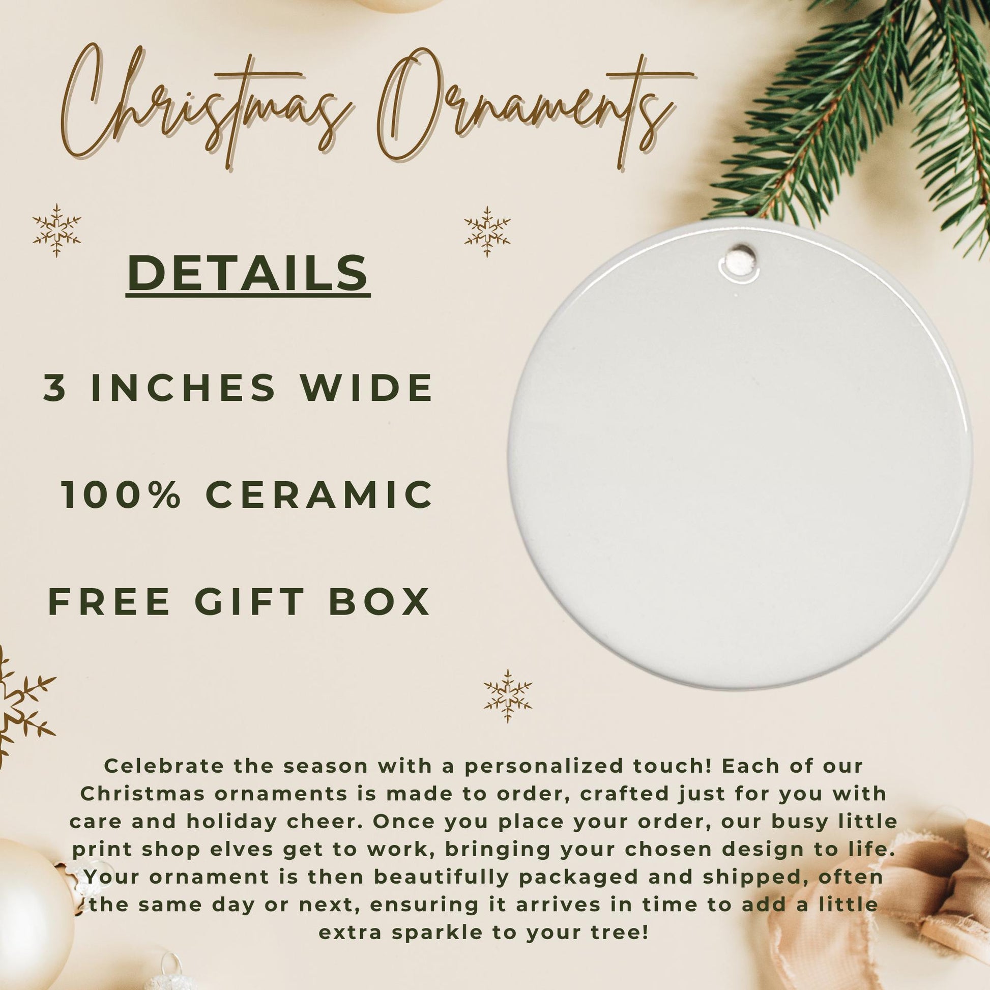 - All of our ornaments are custom printed just for you so we do not accept returns or exchanges