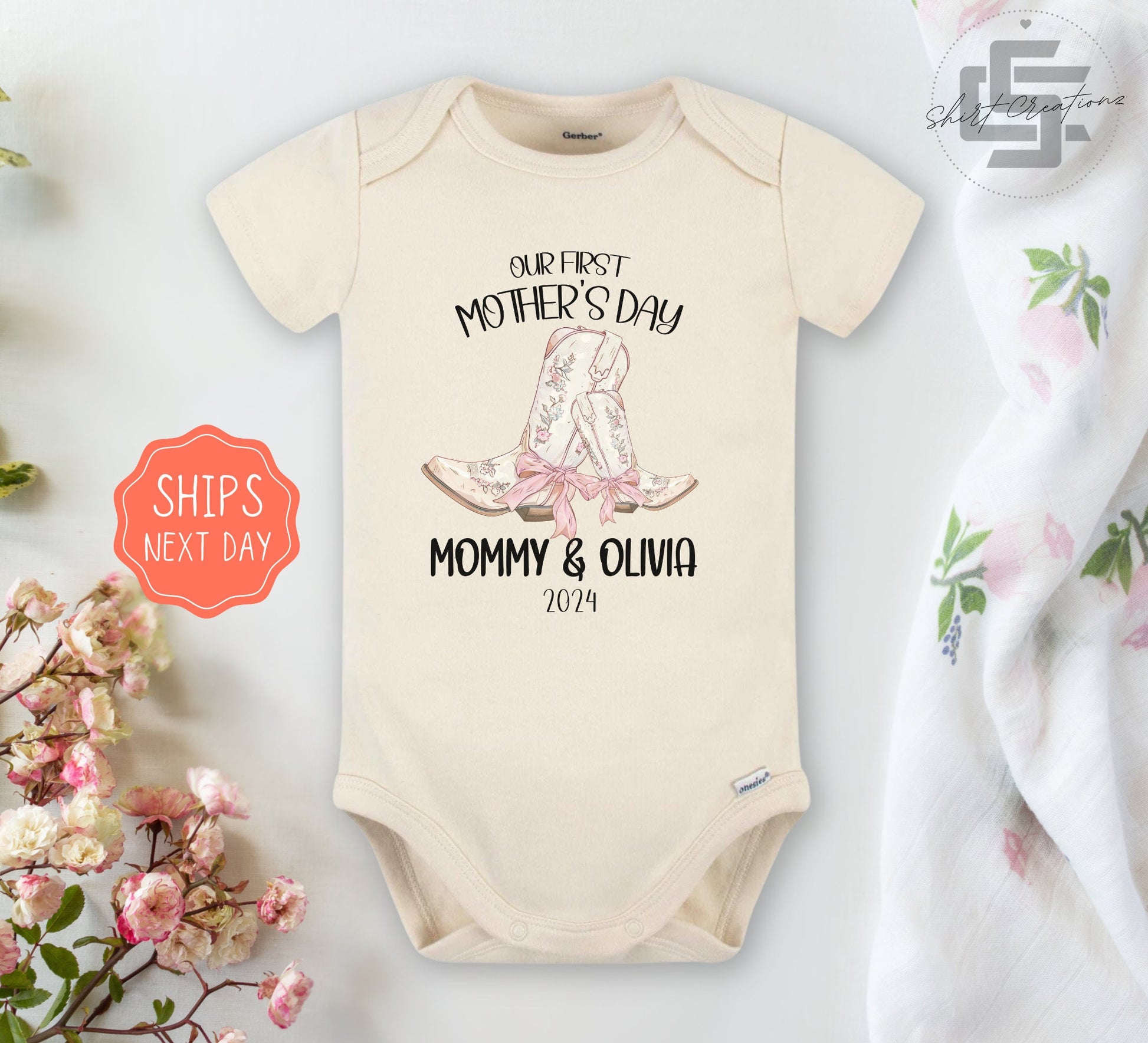 Gift for first mother's Day, Our first mothers day Onesie®, Personalized First Mother's day 2024, Coquette pink first mothers day bodysuit.