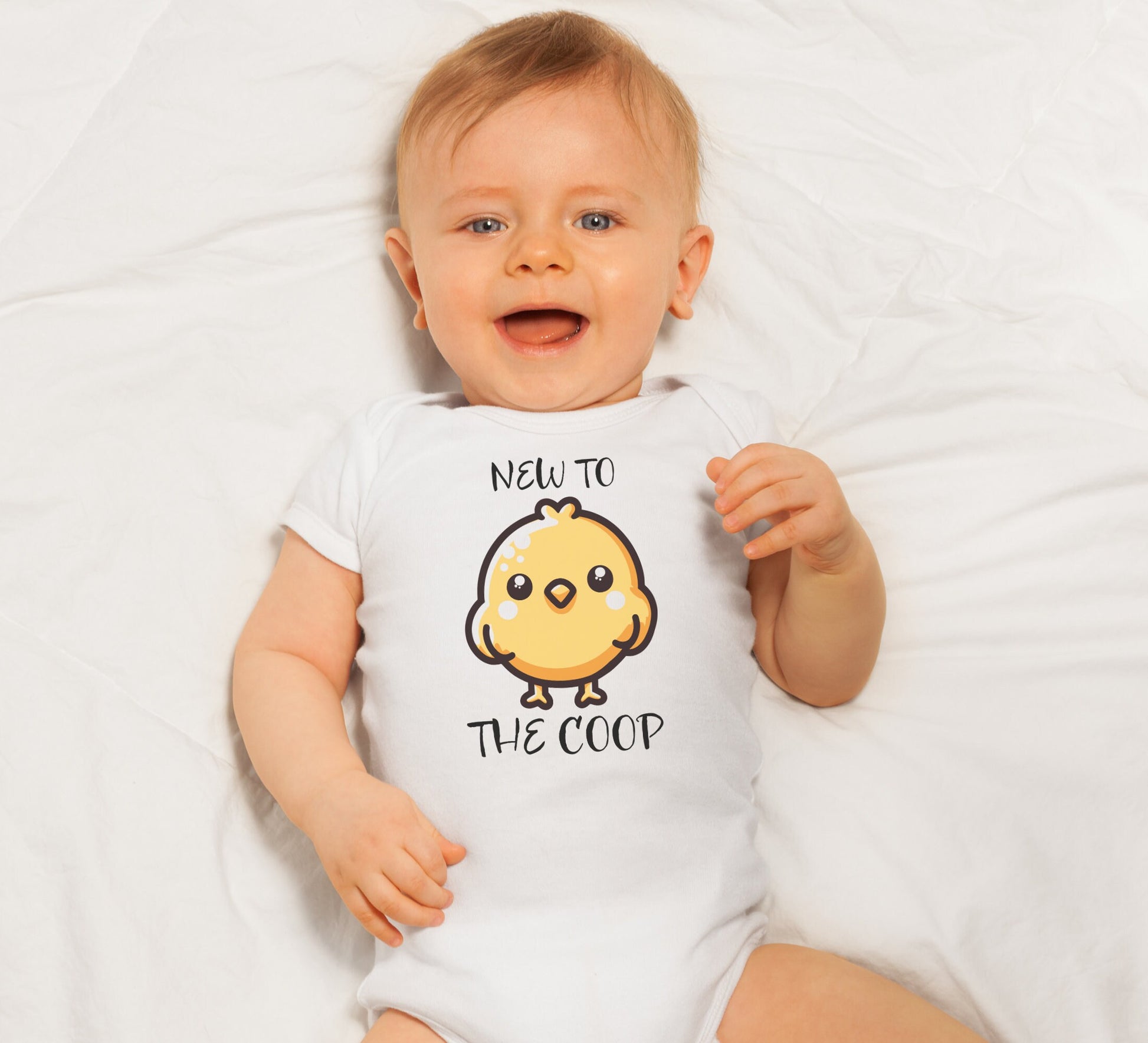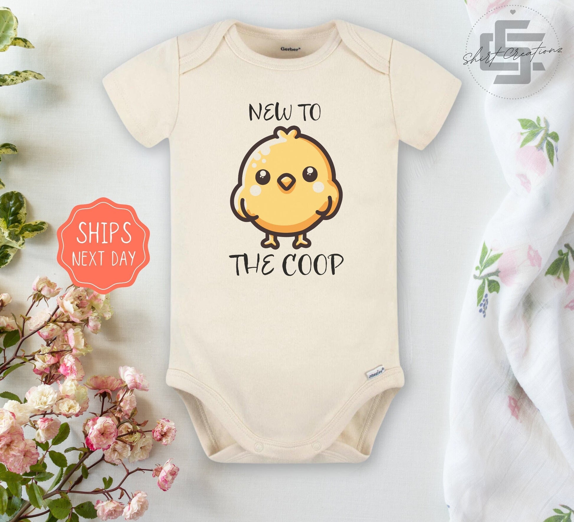 Welcome to the cutest addition to your little one's wardrobe! This adorable onesie featuring a charming baby chick proudly declares "New to the Coop," making it the perfect outfit for your little bundle of joy. Crafted with soft, high-quality cotton, this onesie ensures utmost comfort for your baby's delicate skin while adding a touch of playful charm to their daily attire. Whether it's for a casual day out or cozy cuddle sessions at home, this onesie is sure to garner smiles and compliments wherever your little one goes. A delightful gift for baby showers or welcoming a new arrival, this onesie is bound to become a cherished favorite in any baby's collection.